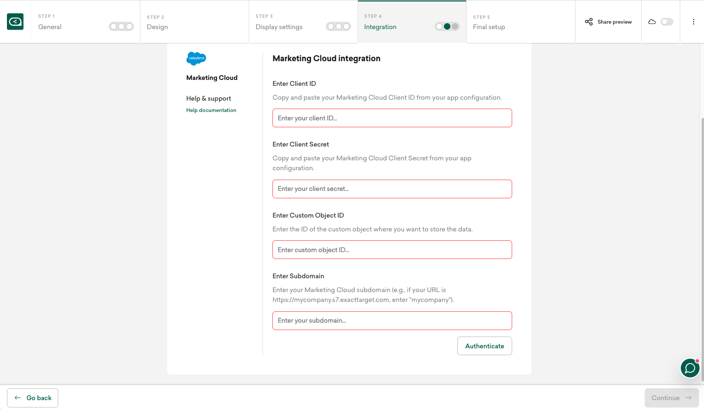 2. Insert your client details such as Client ID, Client Secret, Customer Object Id and your Marketing Cloud subdomain and click “Authenticate”.