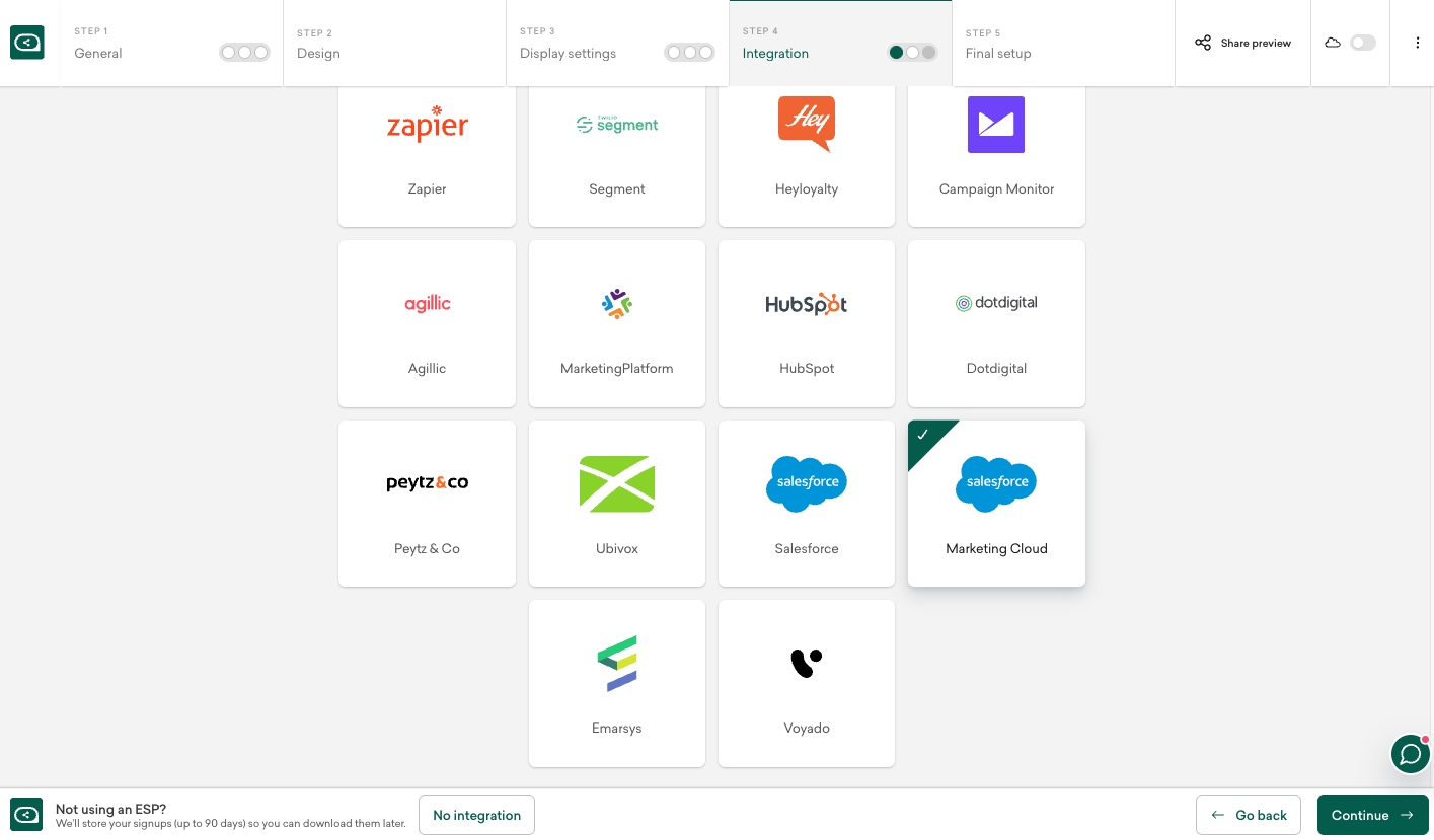 - Go to the Integrations step of your Campaign Builder, select Marketing Clous from the list of available email service providers, and click “Continue”.