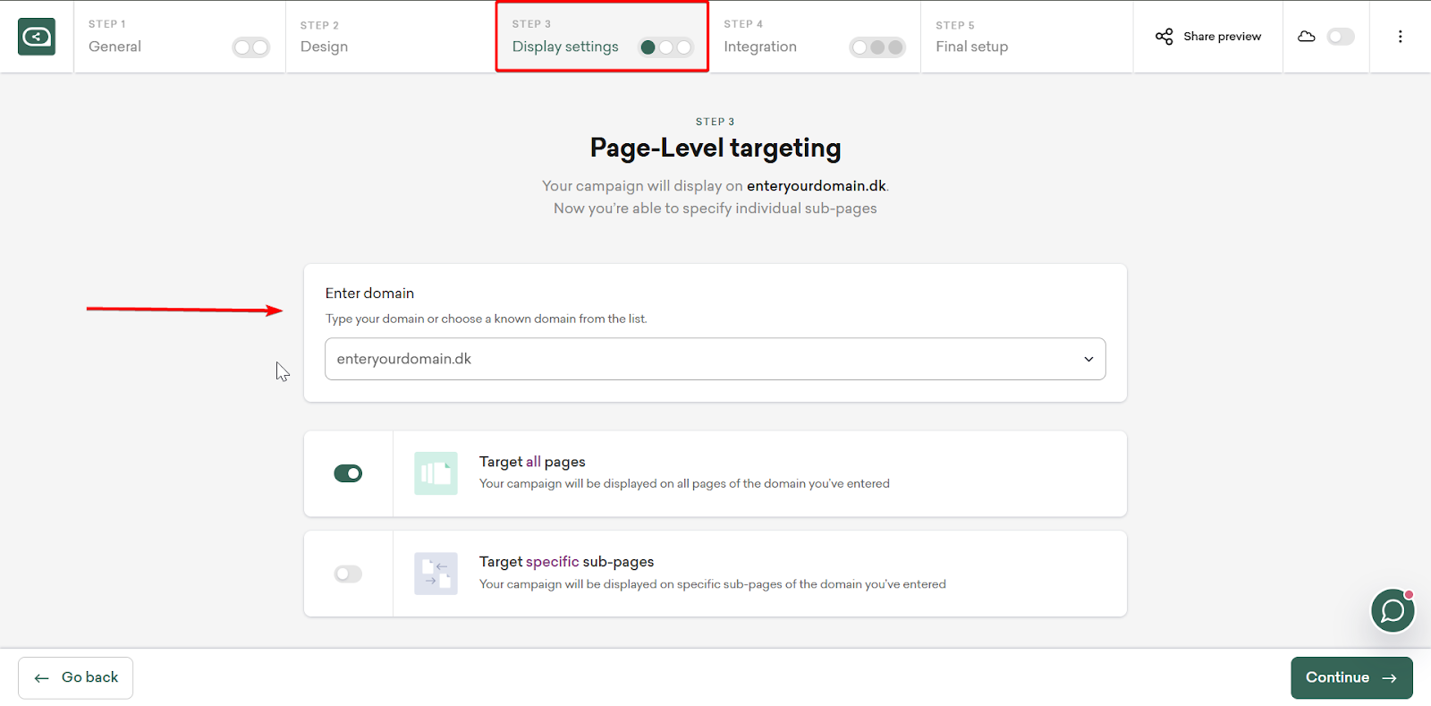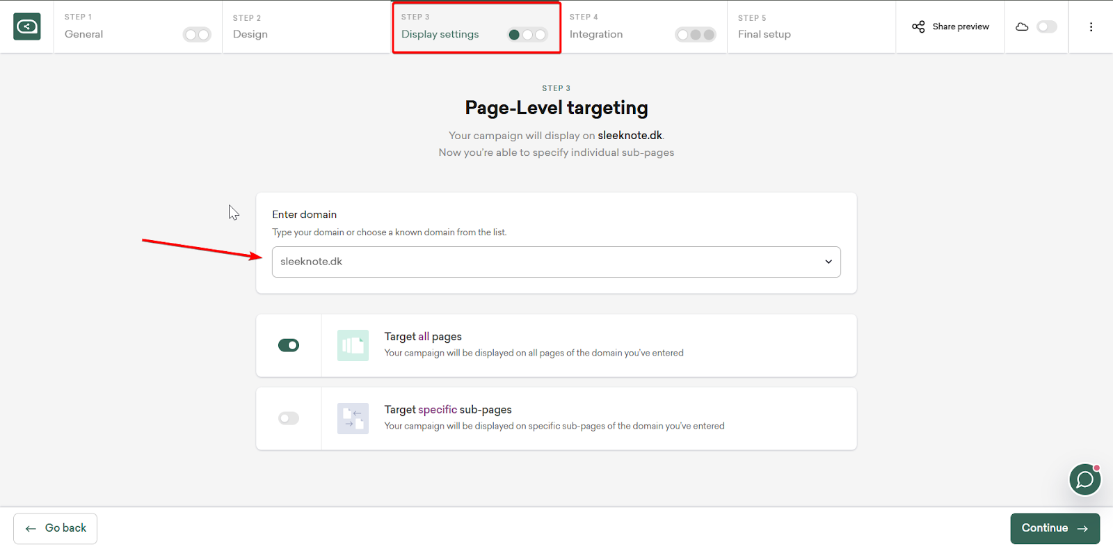 Then, when you create a language-specific campaign, enter the domain you want to show this campaign on in Step 3 - Display Settings: